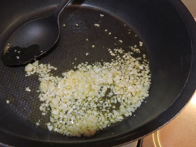 Tillsätt hackad vitlök och salt. Rör om och/eller skaka pannan så vitlöken hålls i rörelse det mesta av tiden. Låt vitlöken bli gyllene – det tar bara ett par minuter – men akta så att den inte bränns.