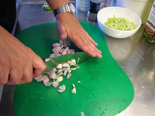 Skala schalottenlök och vitlök. Även om jag älskar min vitlökshackare så är det i det här fallet faktiskt enklare att hacka all löken ihop. Använd en stor vass kniv och håll den som bilden visar för att du inte ska riskera att skära dig i fingrarna.