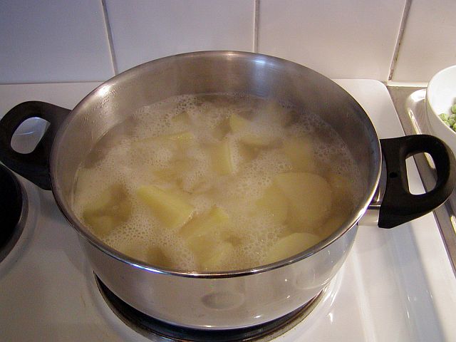 När potatisen och laxen har tillagats i 20 minuter så kontrollerar du med en provsticka om potatisen är mjuk. Är den färdig så häll av vattnet och ånga av potatisen något. Vill du så kan du mosa den lite med en potatisstöt.