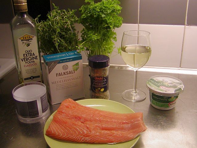 Sprid ut örterna ovanpå laxen med persiljan underst. Ringla över lite olivolja och häll försiktigt på det vita vinet.