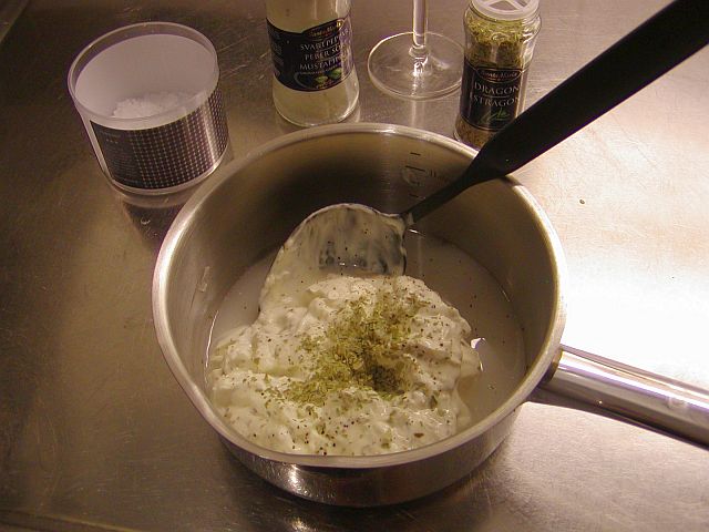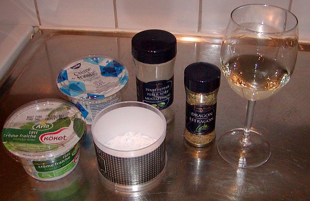Under tiden gör du såsen. Häll båda sorterna crême fraiche i en kastrull, tillsätt det vita vinet och dragon. Rör om ordentligt och låt koka upp.