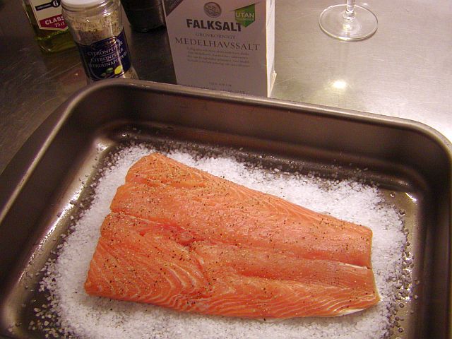 Klappa laxen torr med hushållspapper och placera den ovanpå havssaltet. Strö över lite citronpeppar men salta inte.