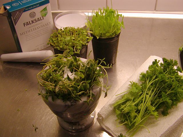 Klipp av yttersta änden av stjälkarna på örterna. Skölj örterna och krama dem med hushållspapper så du blir av med det mesta av vattnet. Lägg dem i en mortel och strö lite havssalt högst upp.