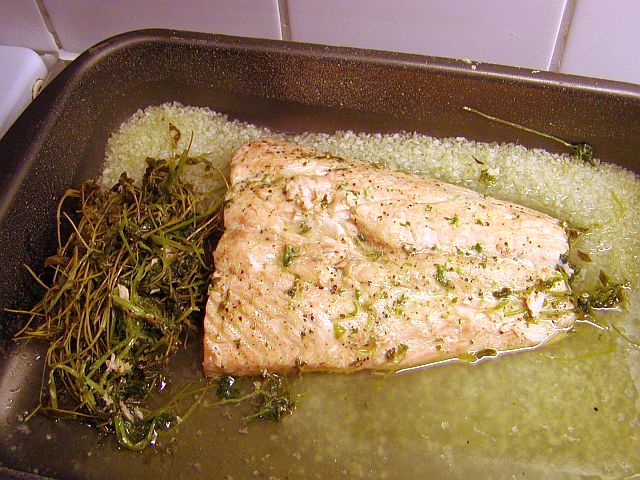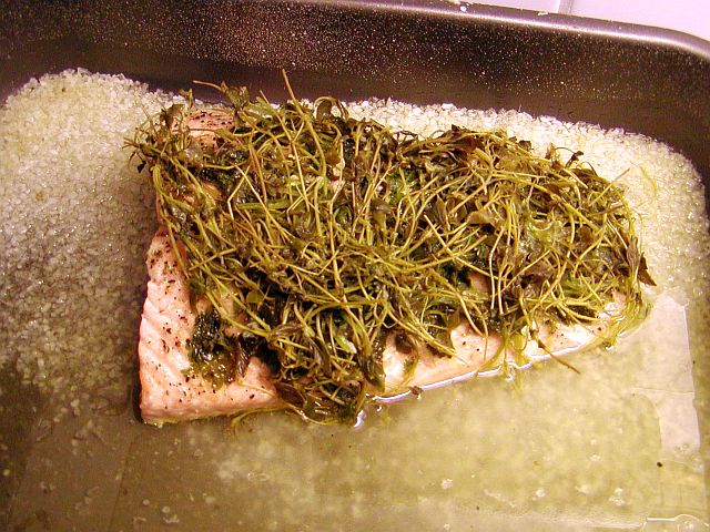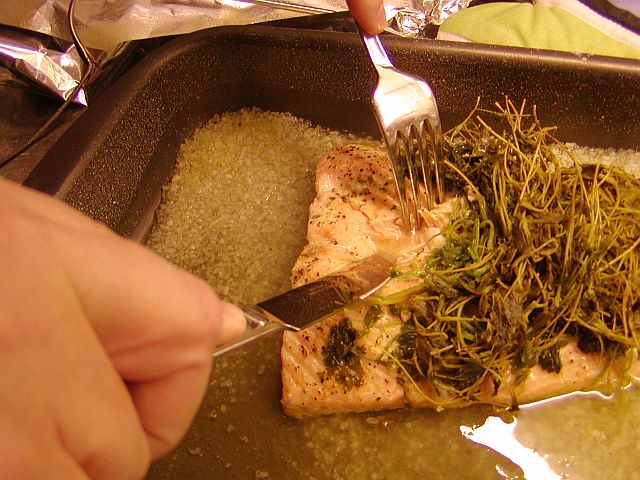När laxen är färdig så skrapar du bort det mesta av örterna. De och saltet kan du nu kasta.