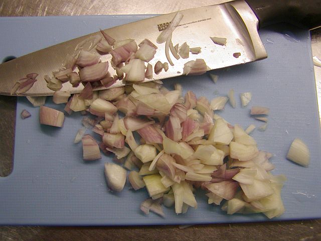 Skala och hacka schalottenlöken. Skölj och hacka persiljan. Skala vitlöken.