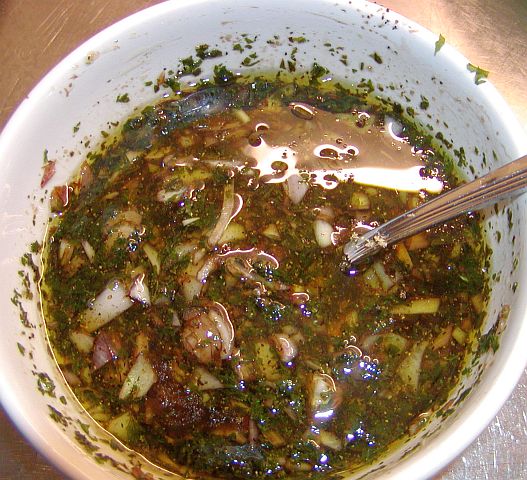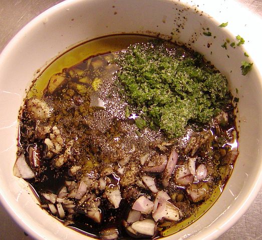 Blanda schalottenlök med hälften av den hackade persiljan i en skål. Pressa över vitlök och tillsätt soja, socker, vinäger och olivolja. Blanda väl och marinaden till kycklingen är färdig.