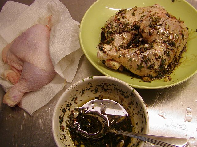 Ta en kycklingklubba i taget och gnid in den med marinad på alla sidor.