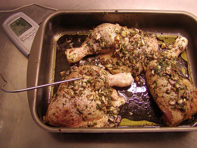 Om du har en stektermometer så kan du gärna använda den: stick i så fall in den i den största kycklingklubban så att termometerns spets vilar mot benet.
