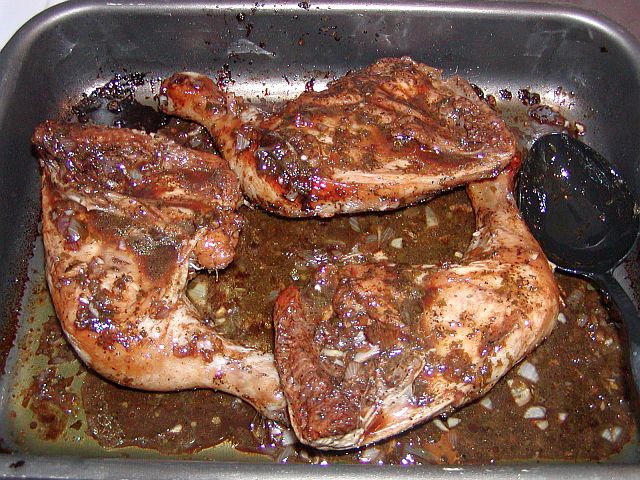 Lägg kycklingklubborna i den smorda formen med skinnsidan upp. Ös över eventuellt kvarvarande marinad.
