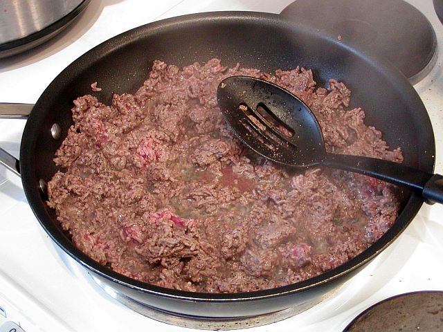 Hetta upp en stekpanna med en liten skvätt olivolja och bryn köttfärsen. När den är färdigstekt så häll köttfärsen i ett durkslag och låt fettet rinna av. Häll den sedan i den gryta som du vill använda för att koka ihop rätten.