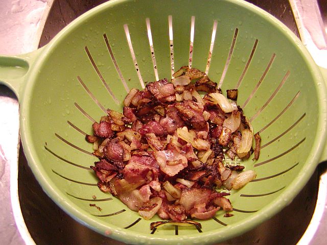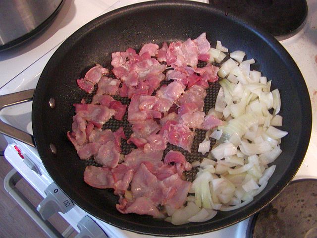 Skala och hacka löken. Skär baconet i bitar. Stek lök och bacon i stekpannan tills de får fin färg. Låt även lök och bacon rinna av i ett durkslag innan du häller dem i grytan.