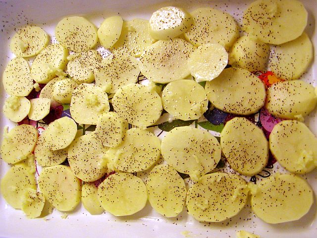 Lägg skivorna i ett lager i botten av den smorda formen. Strö över lite salt och peppar, gärna mindre peppar än på den här bilden (det blev lite väl mycket… ). Pressa över 1-2 vitlöksklyftor.
