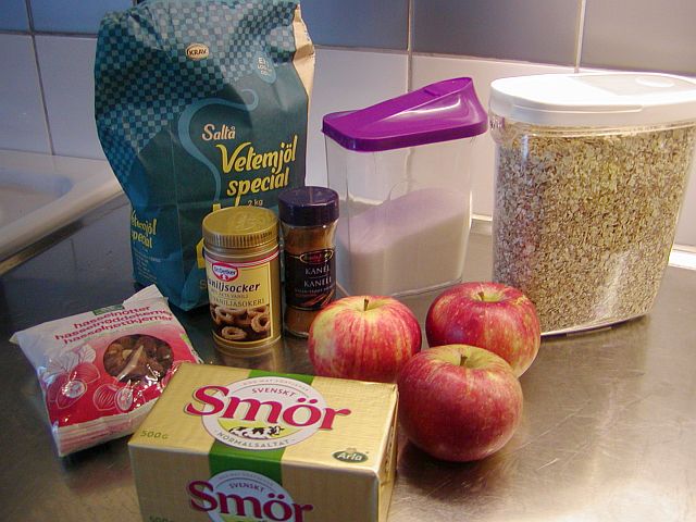 Skala äpplena och skär bort kärnhusen. Skiva sedan äpplena och lägg hälften av äppelskivorna i ett jämnt lager i den smorda pajformen, gärna i ett snyggt mönster. Det syns i och för sig inte under smuldegen, men pajen blir jämnare gräddad än om du bara öser ner äppelskivorna huller om buller.