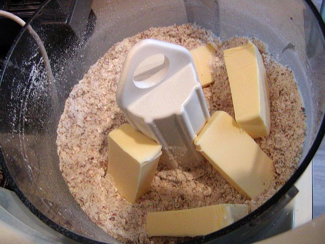Tillsätt havregryn, vetemjöl och 2 msk strösocker i matberedaren och kör tills det är väl blandat. Skär sedan ner 100 gram smör i bitar i mjölblandningen.