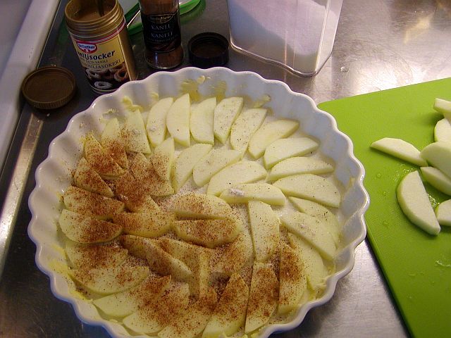 Strö över 1 tsk av vaniljsockret, 1 tsk strösocker och 1½ – 2 msk kanel. Sedan upprepar du proceduren med resten av äppelskivorna, vaniljsocker, strösocker och kanel.