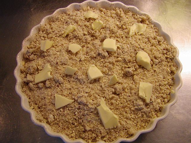 Häll degsmulorna över äpplena och sprid ut dem till ett jämnt lager. Klicka lite smör över och grädda i mitten av ugnen i cirka 20 minuter.