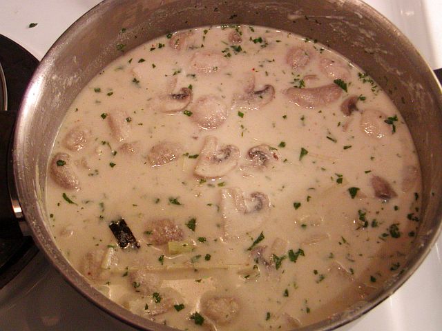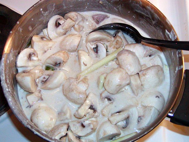 Tillsätt limeblad, citrongräs, galanga, chilipasta (eller hackade chilifrukter), fisksås, limejuice och palmsocker i grytan och rör om. Lägg sedan i kycklingfilén och champinjonerna.