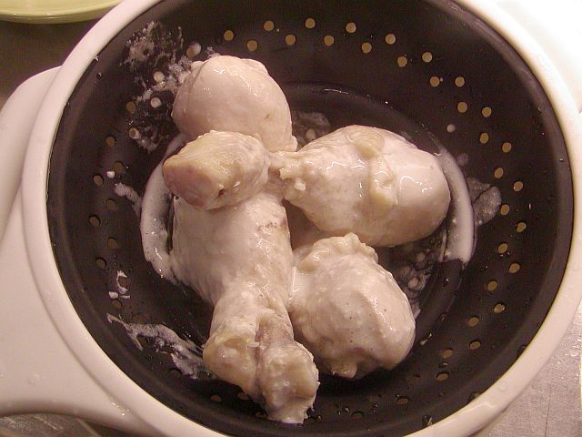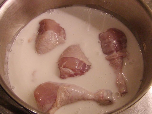 När kycklingbenen har kokat färdigt så sätt ett durkslag över en värmetålig bunke och häll i kokosmjölk och kycklingben. Kycklingbenen får du låta svalna och använda till någon annan maträtt, men kokosmjölken häller du tillbaka i grytan.