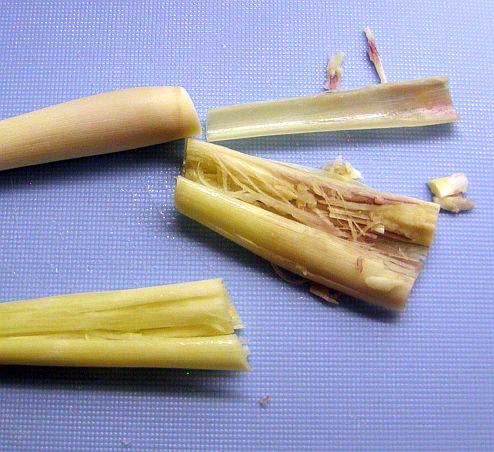 Skär ändarna av citrongräset, skär ett snitt längs med gräset och skala av det yttersta lagret. Sedan skär du citrongräset i lagom långa bitar och bankar ut dem med skaftet på kniven – det får fram smaken på ett fantastiskt sätt.