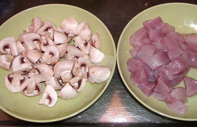 Rensa champinjonerna och kvadrera dem. Skölj kycklingfiléerna och skär dem i bitar. Diska noga skärbräda, kniv och andra redskap som kommit i kontakt med rå kyckling eller dina händer. Tvätta noga händerna innan du fortsätter med matlagningen. Vet du inte varför du ska göra så här när du har hanterat rå kyckling så läs mer på Svensk Fågels sida om campylobacter.