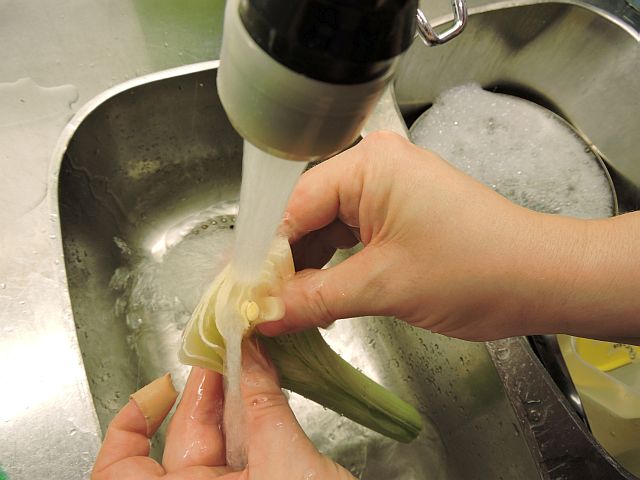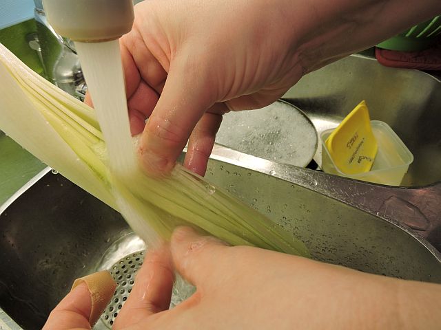 Skölj resten av purjolöken under rinnande vatten, samtidigt som du delar på lökens lager (se bilderna). Börja i lökens ena ände och jobba dig ner mot den andra. Så här ska du göra för att få bort all sand och jord från löken.