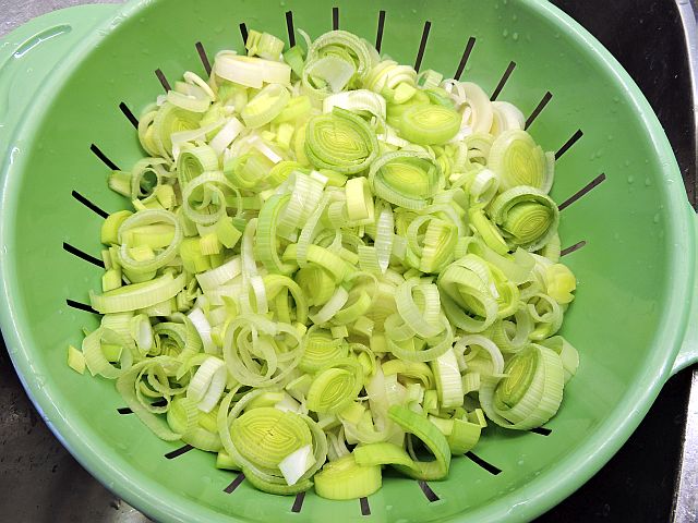 Om du vill så kan du låta den färdigskurna purjolöken rinna av i ett durkslag. Ska du använda stora mängder purjolök kan det ibland vara enklare att skölja den färdigskurna löken i durkslaget, snarare än under vattenkranen. Eller ta det säkra före det osäkra och gör både och – det brukar jag oftast göra.