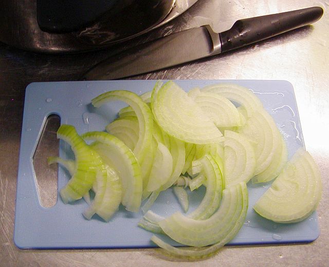 Skala löken, dela den på mitten och skär i tunna skivor.
