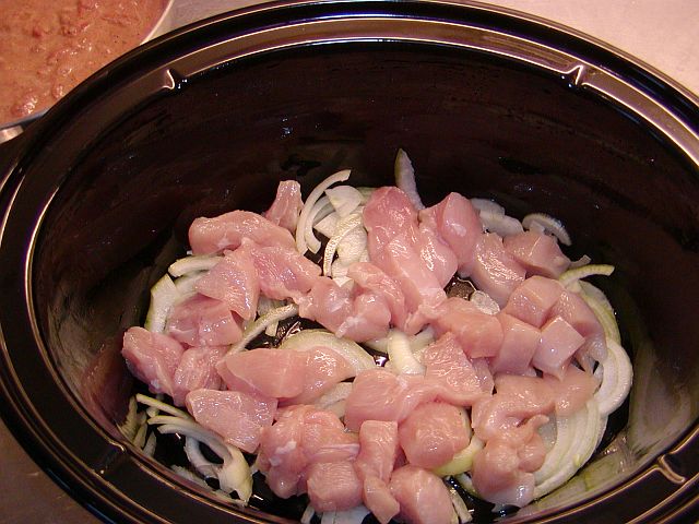 Smörj den gryta du vill använda med lite rapsolja. Sprid ut den skivade löken i botten av grytan och kycklingbitarna ovanpå.