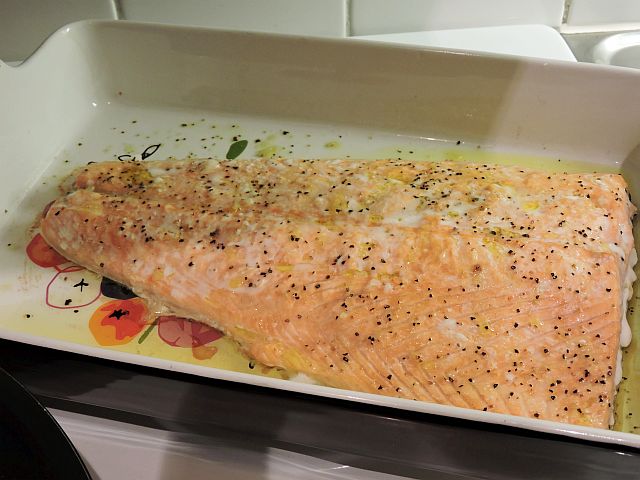 Lägg laxen i formen och strö över lite salt och citronpeppar. Täck med ugnsfolie och baka sedan laxen i mitten av ugnen i 15 minuter.