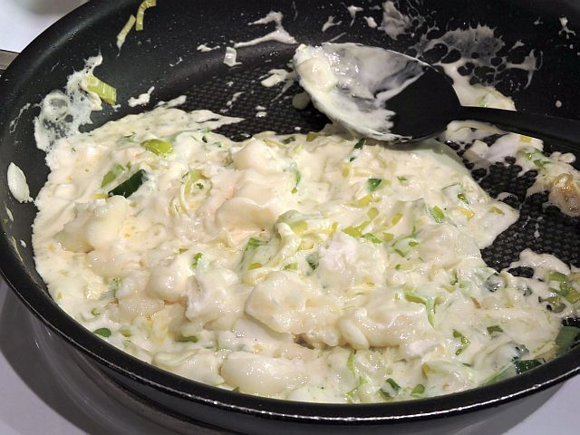 Häll i crême fraiche och rör om ordentligt. Låt sakta puttra ihop till en sås. Rör då och då så att den inte bränns vid.