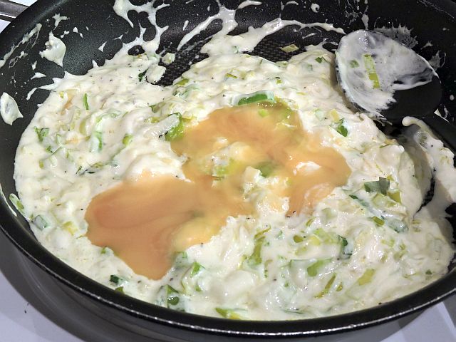 Under tiden så rensar du purjolöken och skivar den tunt. Skär chèvreosten i tjocka skivor och sedan i bitar.