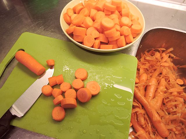 Skala och hacka lök och vitlök. Skala morötterna, skär bort de yttersta delarna av morotens ändar och skiva resten grovt. Lägg morotsbitarna i en stor gryta (jag använde min slow cooker men en vanlig stor gryta går också bra).