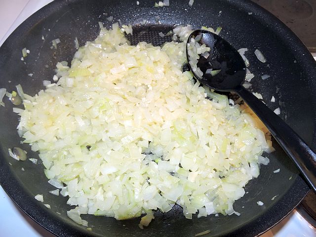 Hetta upp en stekpanna med olivolja och en liten klick smör. Stek lök och vitlök med en liten nypa salt på medelhög värme i cirka 5 minuter tills löken är mjuk och glansig. När löken är färdig så häll den i grytan med morötter.