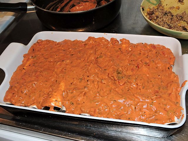 Packa enchiladasarna (om det heter så) ganska tätt i formen så de inte rullar upp sig. Häll sedan såsen över enchiladasarna och bre ut den i ett jämnt lager.