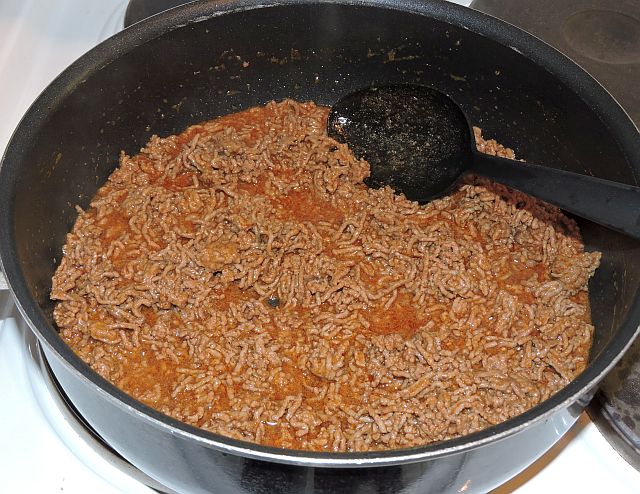 Häll lite mer olivolja i pannan och bryn köttfärsen. När köttfärsen har stekt färdigt så häller du innehållet i påsen med Taco-mix över den tillsammans med 1 dl kallt vatten. Rör om och låt puttra ihop i 10 minuter.