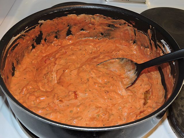 Hacka den gröna chilin och tillsätt i stekpannan. Tillsätt tomatsås, chilipulver, vitlökspulver och crême fraiche. Rör om noga och låt puttra ihop i cirka 5 minuter.