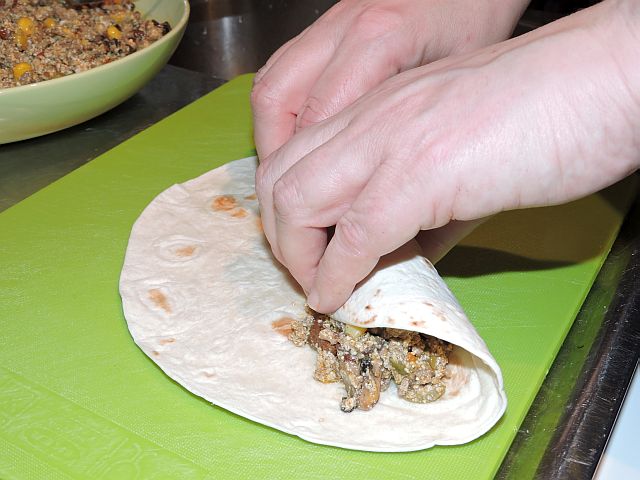 Sätt ugnen på 180°C för varmluft (200°C för vanlig ugn). Smörj en ugnsfast form som rymmer 8 ihoprullade tortillas. Lägg en tortilla på en skärbräda och skeda upp cirka 1 dl fyllning.