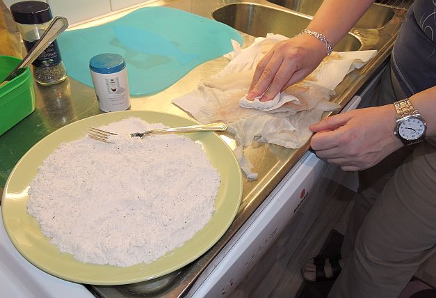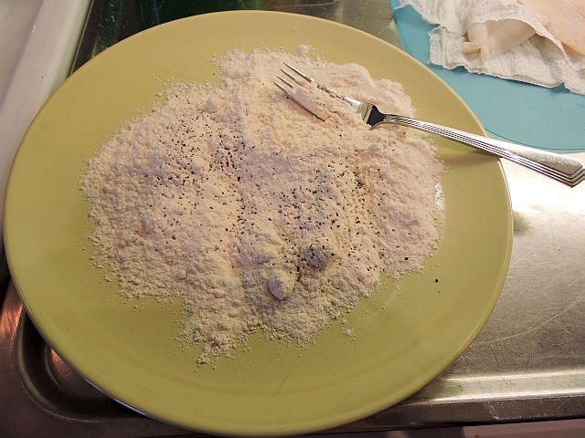 Häll upp mjöl på en stor flat tallrik. Krydda mjölet med svartpeppar och rör om med en gaffel.