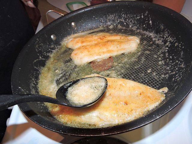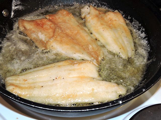 Under tiden du steker fisken så öser du hela tiden smält smör över den. Det är det som gör fisken så fantastiskt god. Börjar smöret ta slut så får du ha i mer i stekpannan.