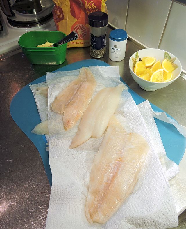 Servera genast med potatis och andra tillbehör. Låt var och en pressa citron över fisken vid matbordet.