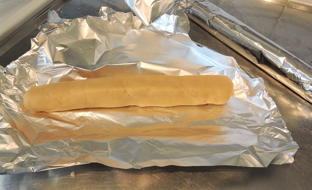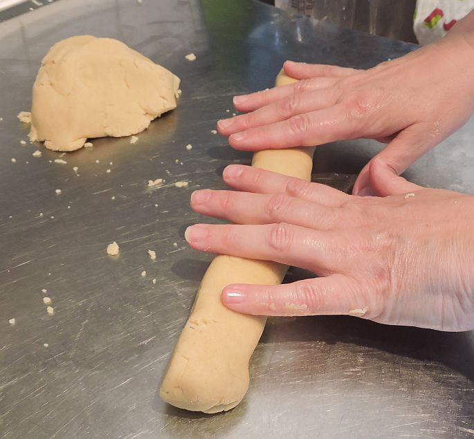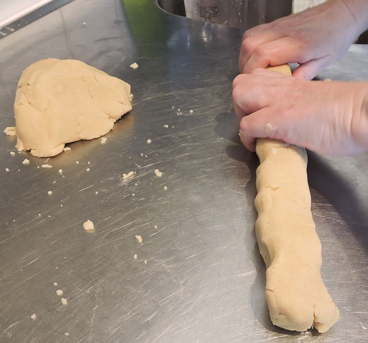 Nu bör degen hålla ihop tillräckligt för att du ska kunna dela den i två bitar. Forma sedan dem till två långa rullar, cirka 4 cm i diameter.