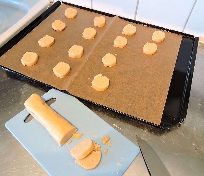 När degrullarna vilat färdigt så tar du ut en av dem ur kylskåpet och skär den i ½ cm tjocka skivor.