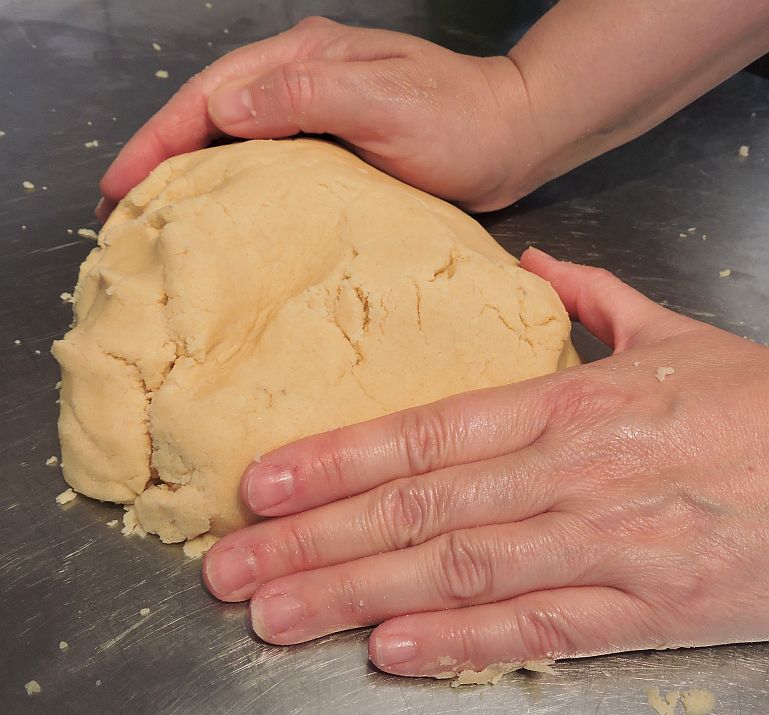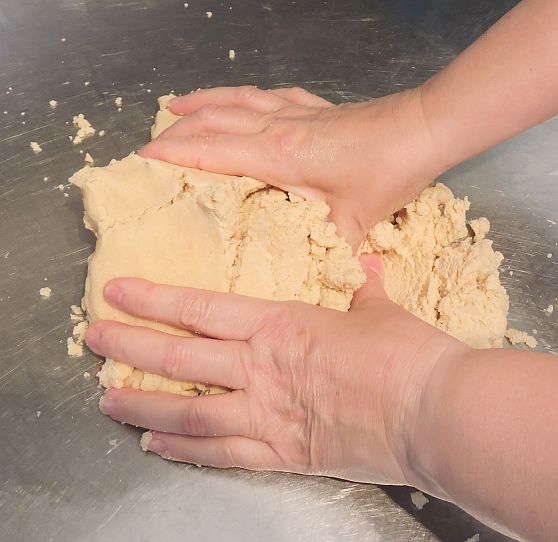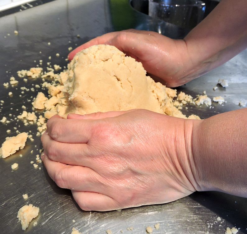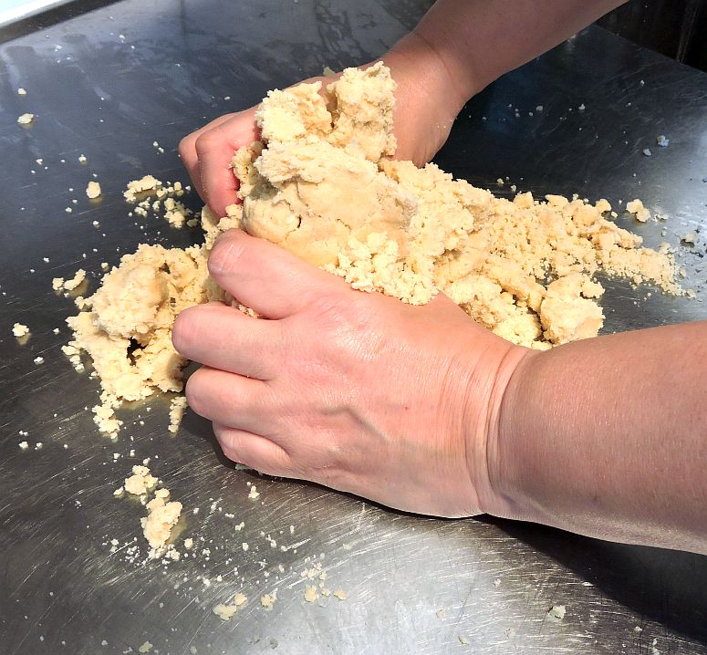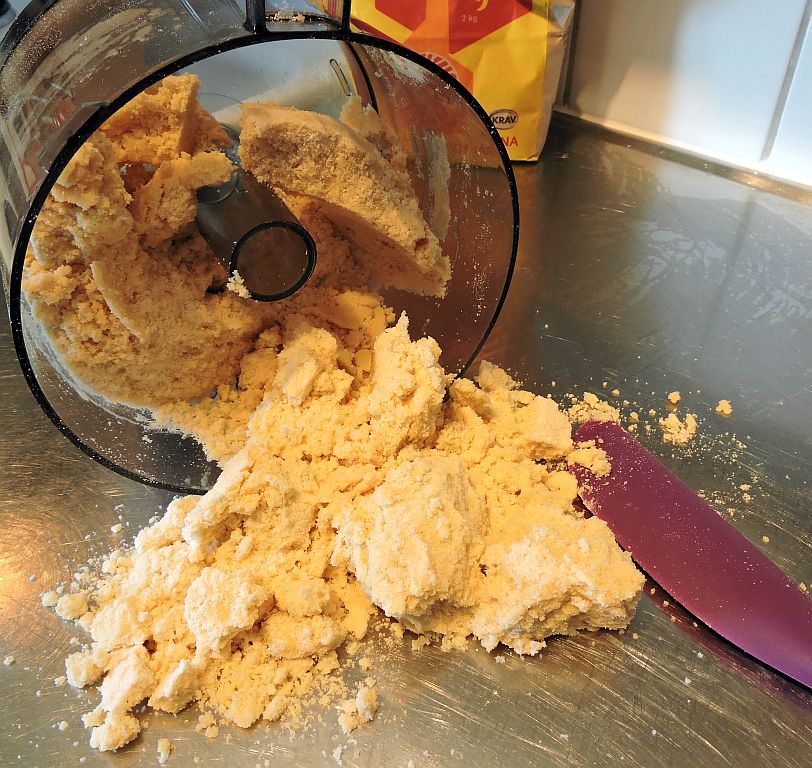 Som du ser så är degen väldigt smulig och håller inte ihop alls. Det är fullt normalt – det är nu ditt jobb att knåda den tills den håller ihop.Fös ihop degen med rena händer och krama och knåda den väl.