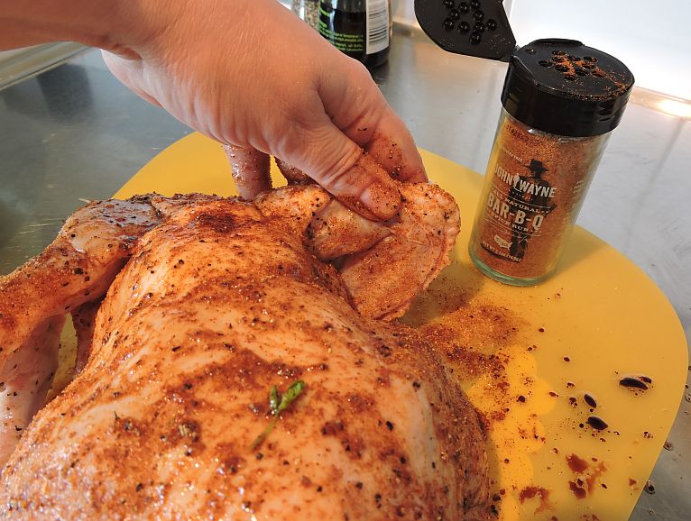 Strö BBQ-krydda över kycklingen där du har penslat den. Gnid in ordentligt med fingrarna.