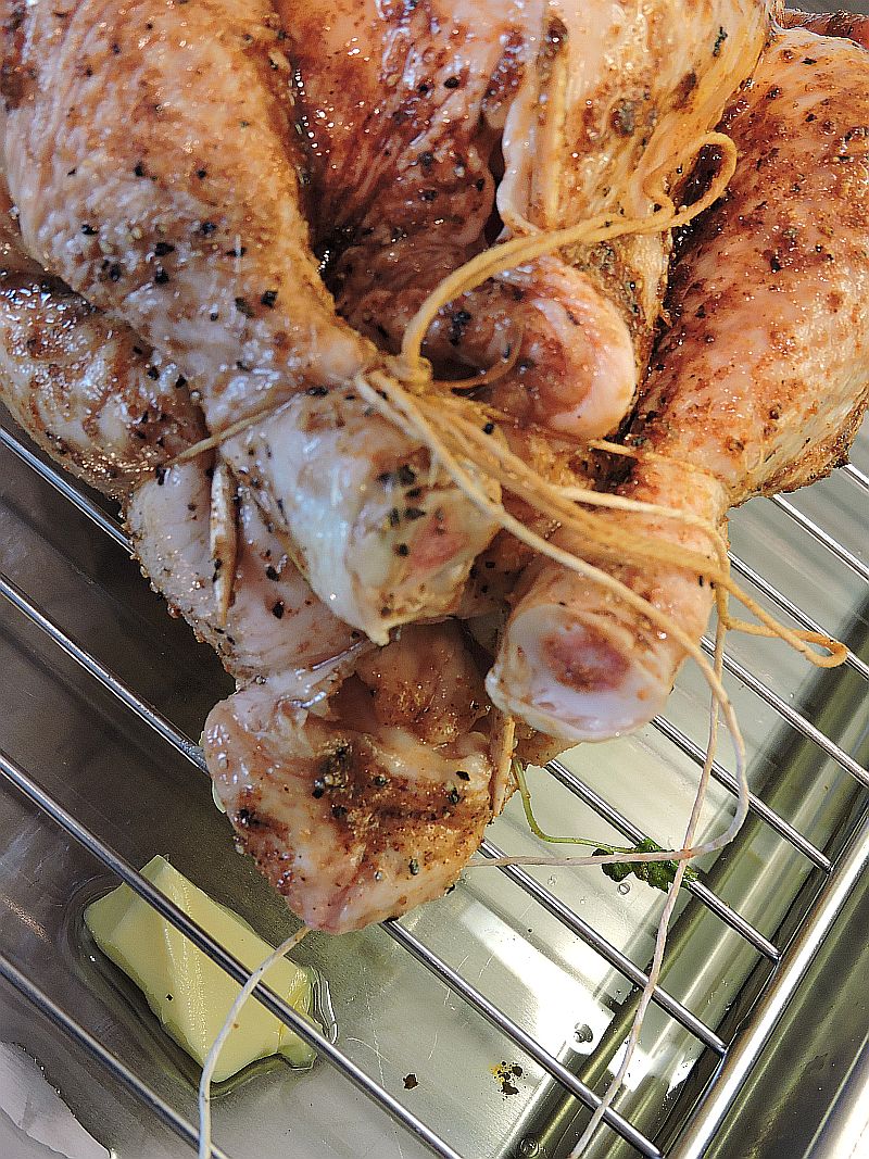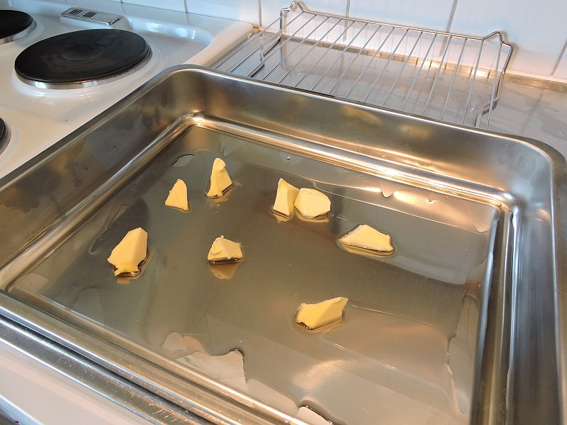 Värm under tiden ugnen till 110°C för varmluft (125°C för vanlig ugn). Ta fram en ugnsfast form med galler och täck bottnen av den med rapsolja. Klicka i smöret. Tanken är att smöret ska smälta ihop med oljan så att du kan ösa kycklingen med det under tiden som den tillagas.