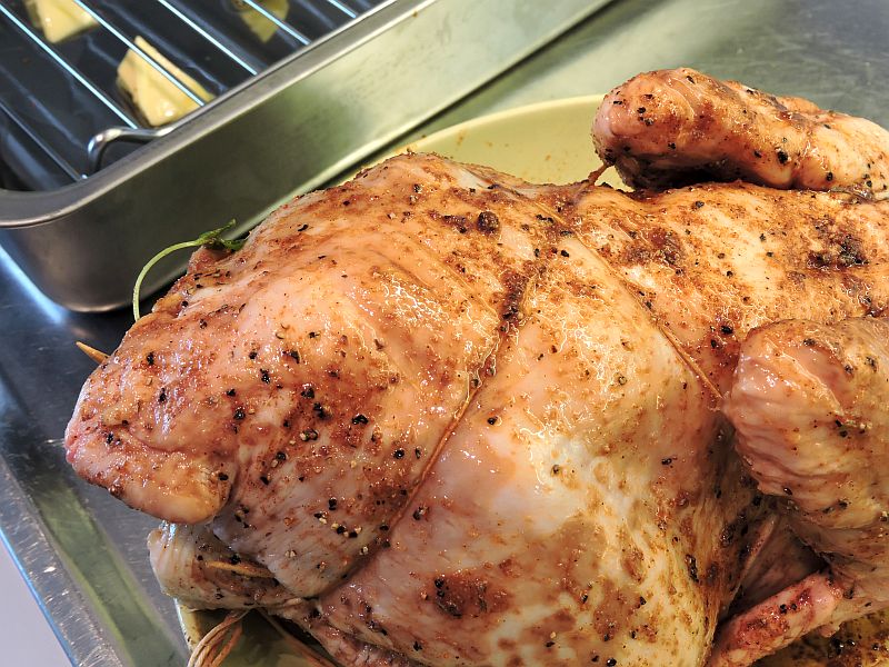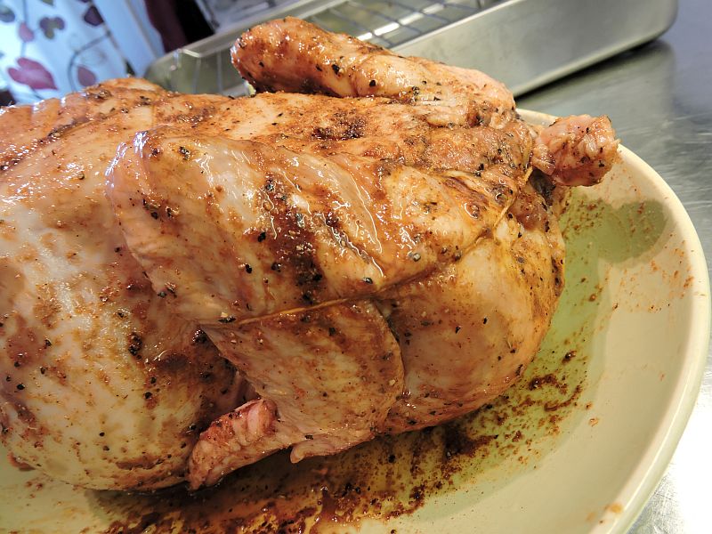 Lägg kycklingen med bröstet uppåt på gallret till din ugnsfasta form. Häll över eventuell krydd- och oljeblandning som finns kvar i skålen som du hade ställt åt sidan.