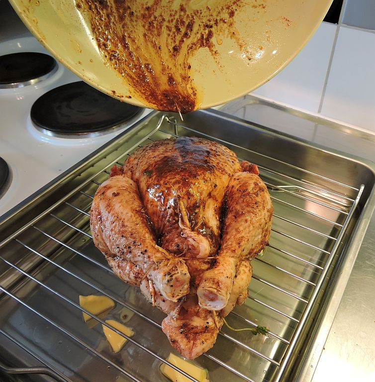 Kontrollera gärna genom att sticka kycklingen i låret – om saften som kommer ut är klar och ofärgad så är kycklingen färdig. Är saften rosafärgad så behöver den lite mer tid.