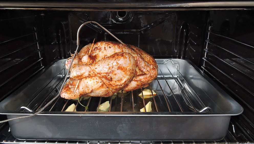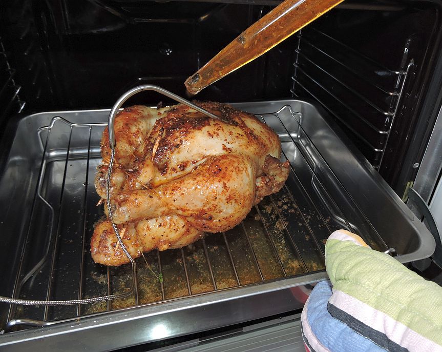 Kycklingen är färdig när innertemperaturen är 72°C i bröstköttet eller 82°C i låret intill benet.