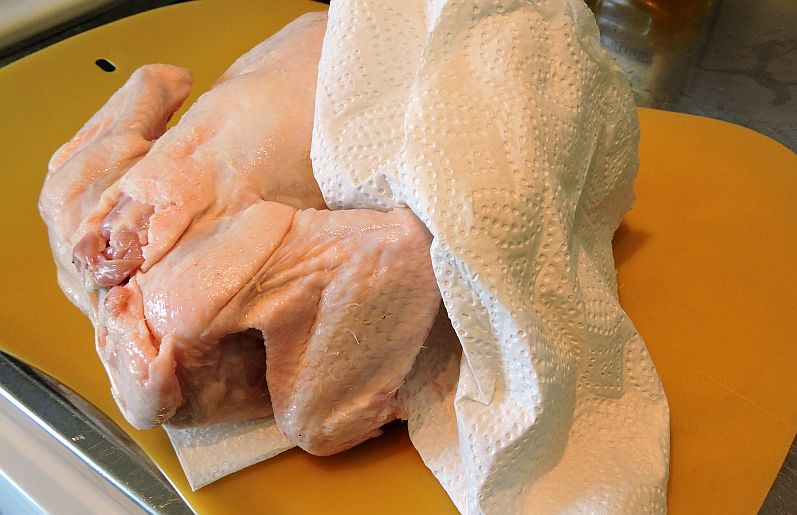 Skölj kycklingen i kallt vatten, både in- och utvändigt. Ibland har hel kyckling en liten påse med lever och andra godsaker instoppat inuti kycklingen – ta i så fall ut påsen innan du sköljer kycklingen. Klappa kycklingen torr med hushållspapper.
