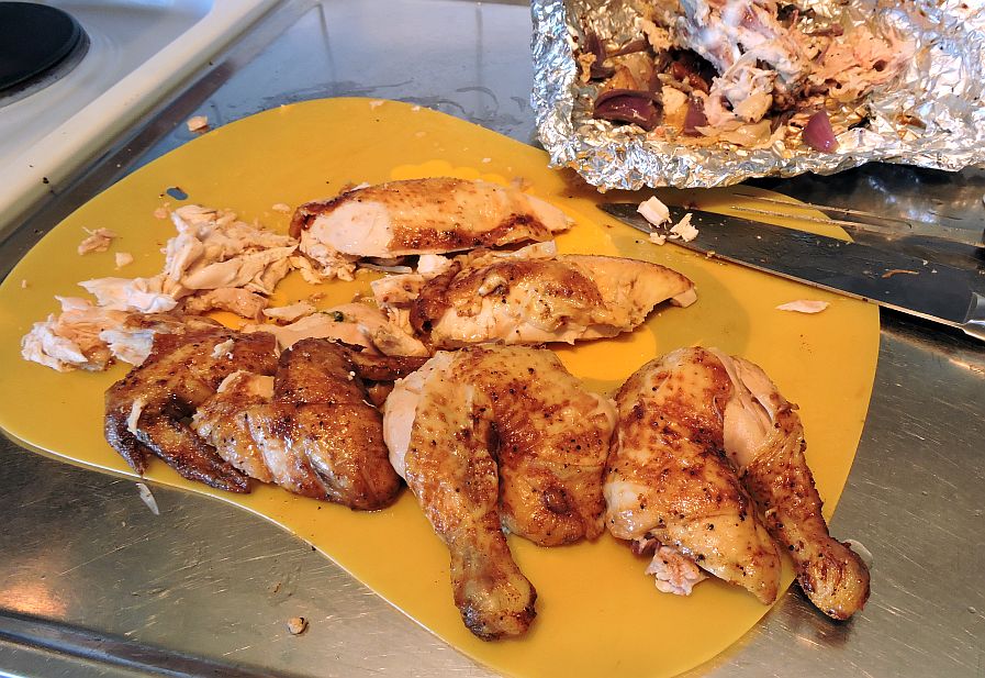 Svep in kycklingen i aluminiumfolie och låt den vila i minst en halvtimme. Då kommer den också att eftersteka lite.
